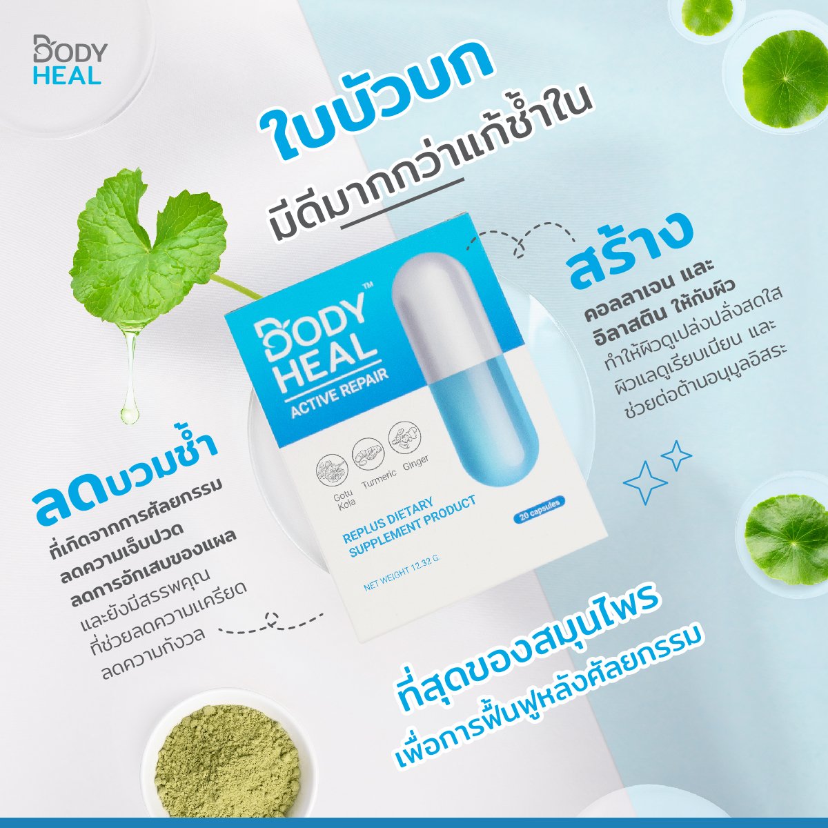 BodyHeal เป็นอาหารเสริมที่สามารถช่วยเกี่ยวกับภาวะความเครียดหลังศัลยกรรมได้ เพราะมีส่วนประกอบสำคัญอย่างใบบัวบกที่มีปริมาณมากที่สุด ซี่งใบบัวบกมีคุณสมบัติช่วยลดความเครียด และคลายกังวลหลังศัลยกรรมได้ นอกจานี้ยังมีสรรพคุณช่วยลดบวมช้ำ ฟื้นฟูเรื่องแผลหลังศัลยกรรม ในสมัยก่อนหากคนที่มีความเครียดมากๆ มักจะนำใบบัวบกมาตำ หรือปั่นเพื่อรับประทาน แต่แน่นอนว่าการรับประทานใบบัวบก อาจจะยากสำหรับบางคน เราจึงทำเป็นแคปซูลเพื่อให้รับประทานง่าย แค่ดื่มกับน้ำเปล่าก็ช่วยลดภาวะความเครียด และช่วยลดบวมได้เร็วยิ่งขึ้น