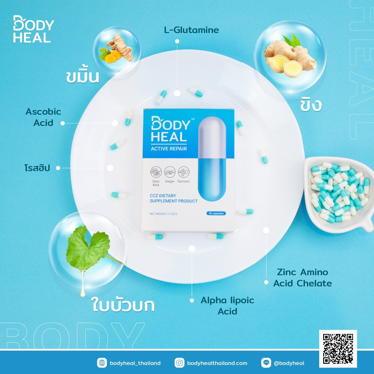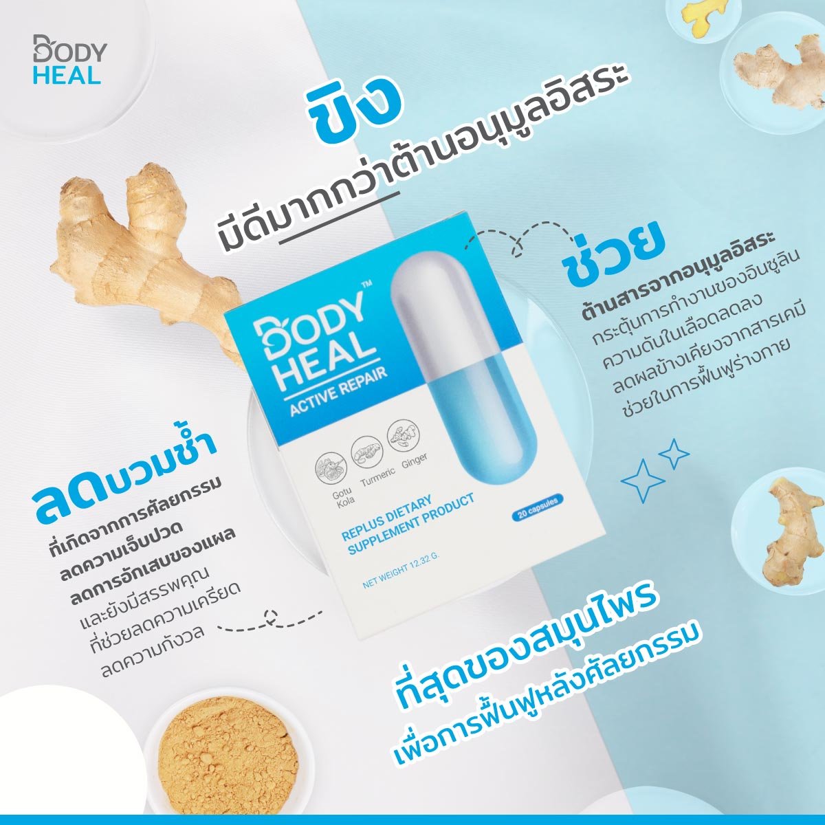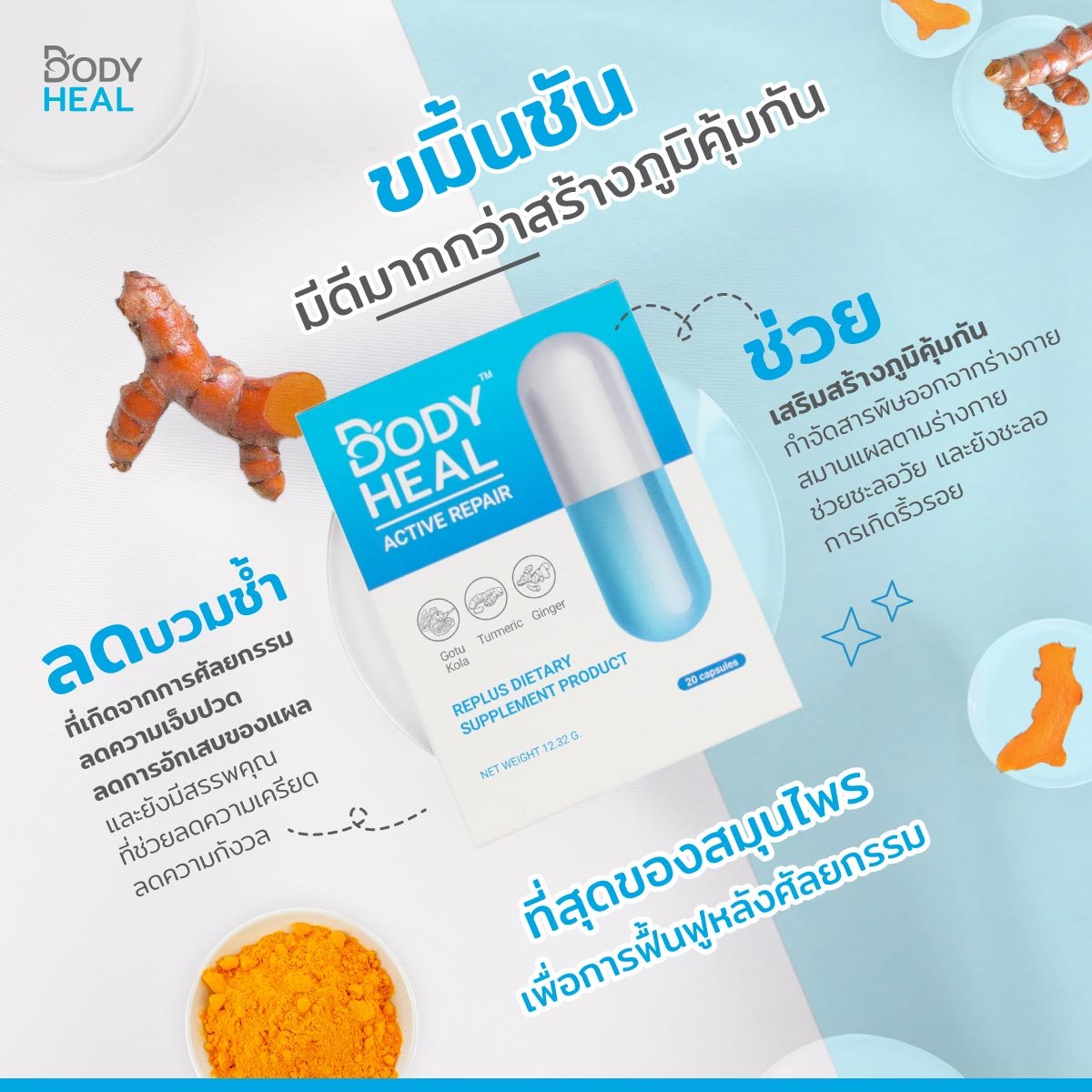 หากจะให้รับประทานสมุนไพรที่มีประโยชน์ในการฟื้นฟูศัลยกรรม อาจจะยากสำหรับบางคน และยังต้องใช้เวลาในการสกัดสด ซึ่งอาจไม่เหมาะกับคนไม่มีเวลาและรับประทานยาก Bodyheal มองเห็นตรงนั้น จึงทำอาหารเสริมที่รวบรวมสมุนไพร และส่วนประกอบที่สำคัญในการฟื้นฟูหลังศัลยกรรม โดยสารสกัดขิงและขมิ้นชันถือว่าเป็นส่วนประกอบหลังใน Bodyheal รองลงมาจากสารสกัดจากใบบัวบก โดย Bodyheal ได้ใช้วิธีการสกัดที่เหมาะสมเพื่อให้คุณสมบัติของสมุนไพรต่างๆที่ใส่ในแคปซูลยังคบอยู่ครบ และช่วยฟื้นฟูคนทำศัลยกรรมได้ดี