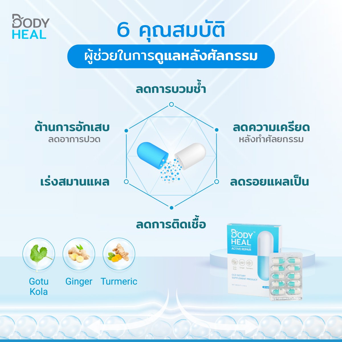 Bodyheal อาหารเสริมหลังศัลยกรรมที่มีส่วนประกอบหลักคือสารสกัดจากธรรมชาติ ใบบัวบก ขมิ้น และขิง รวมถึงส่วนประกอบอื่นๆที่มีประโยชน์ต่อการฟื้นฟูหลังศัลยกรรม มี 6 คุณสมบัติเด่นดังนี้